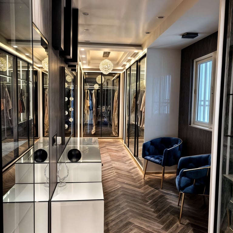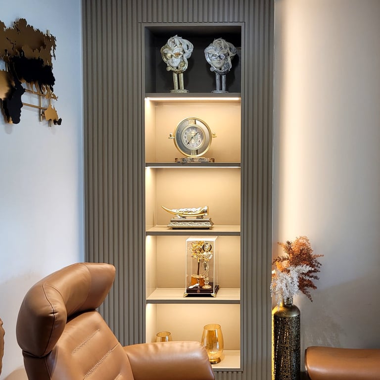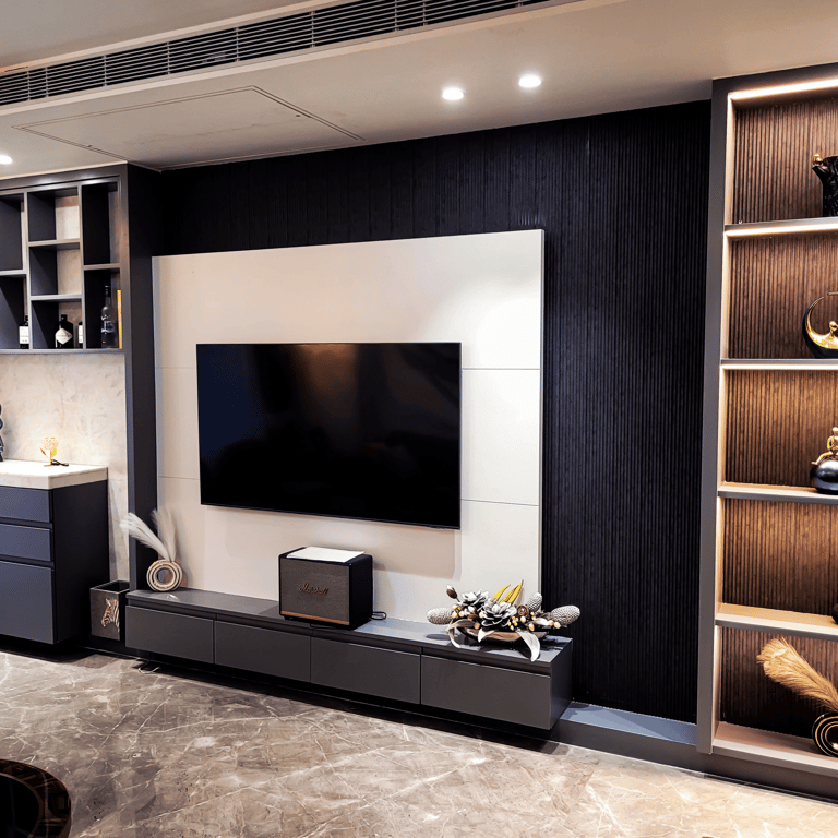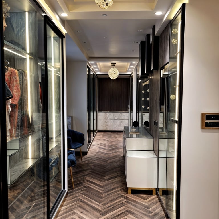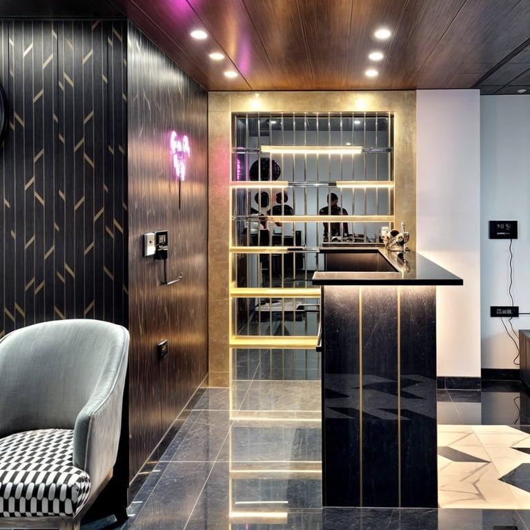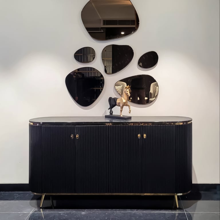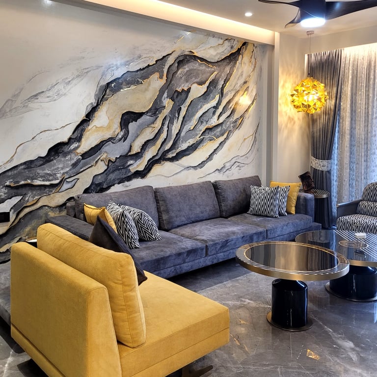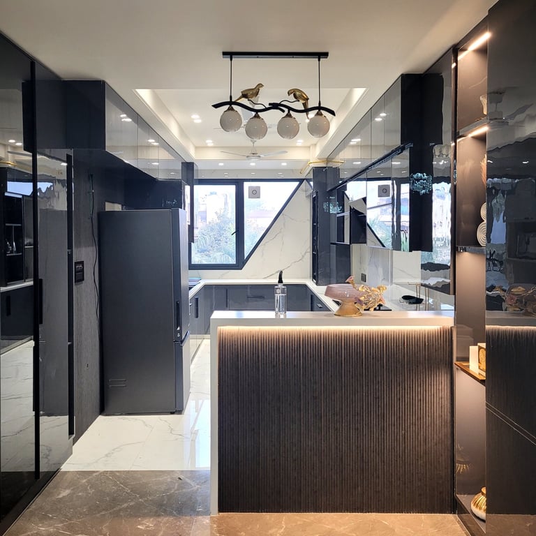 The residence features a luxurious gold on black color palette, with stone work and work with excellent craftsmanship.