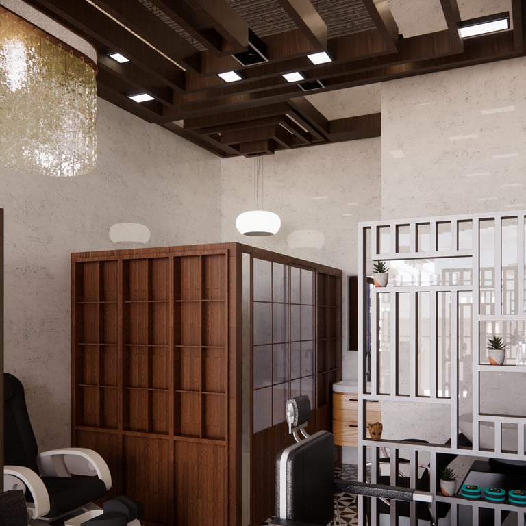 A minimal rather open design with the help of screens and light partition walls. Repurposing the wooden slats as the ceiling with lights and speakers.